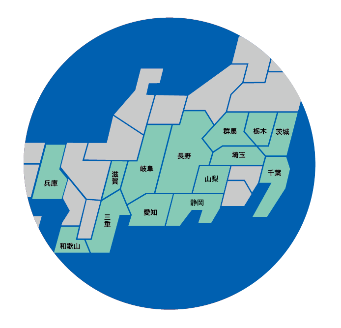 栃木県 / 茨城県 / 群馬県 / 埼玉県 / 千葉県 / 長野県 / 静岡県 / 山梨県 / 岐阜県 / 愛知県 / 三重県 / 兵庫県 / 滋賀県 / 和歌山県